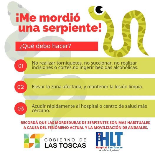 ✔️ En caso de mordedura tratar de visualizar las características de la serpiente y acudir rápidamente al hospital o centro de salud más cercano.