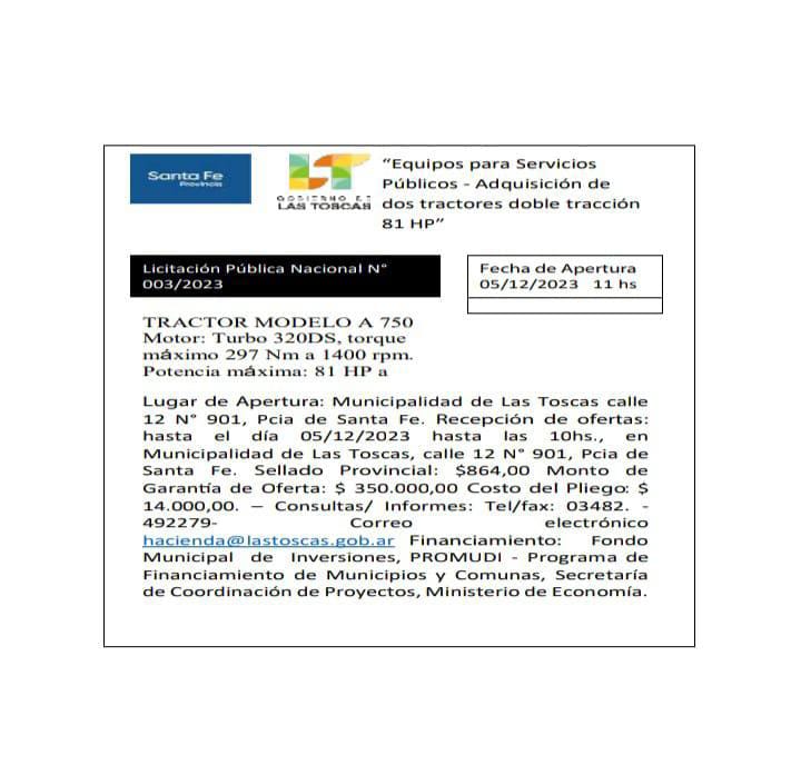 El gobierno de la ciudad de Las Toscas, llama a licitación para la adquisición de equipos para Servicios Públicos, como ser dos tractores doble tracción, de 81 HP, modelo A750.