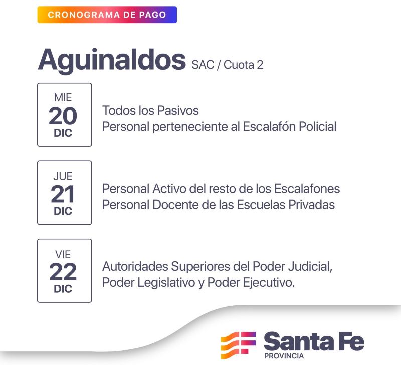 El miércoles 20 se dará inicio al pago del aguinaldo para los agentes provinciales. En primer turno cobrarán todos los pasivos y el personal perteneciente al escalafón policial. El jueves 21 será el turno del personal activo del resto de los escalafones y el personal docente de las escuelas privadas. Finalmente, el viernes 22 cobrarán las autoridades superiores del Poder Judicial, Poder Legislativo y Poder Ejecutivo.