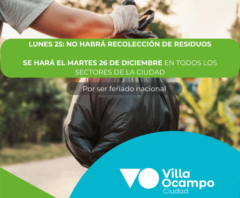 La Municipalidad de Villa Ocampo informa que el día lunes 25 de diciembre, al ser feriado nacional, no hubo recolección de residuos domiciliarios. La misma se realizará este martes 26 de diciembre en todos los sectores.