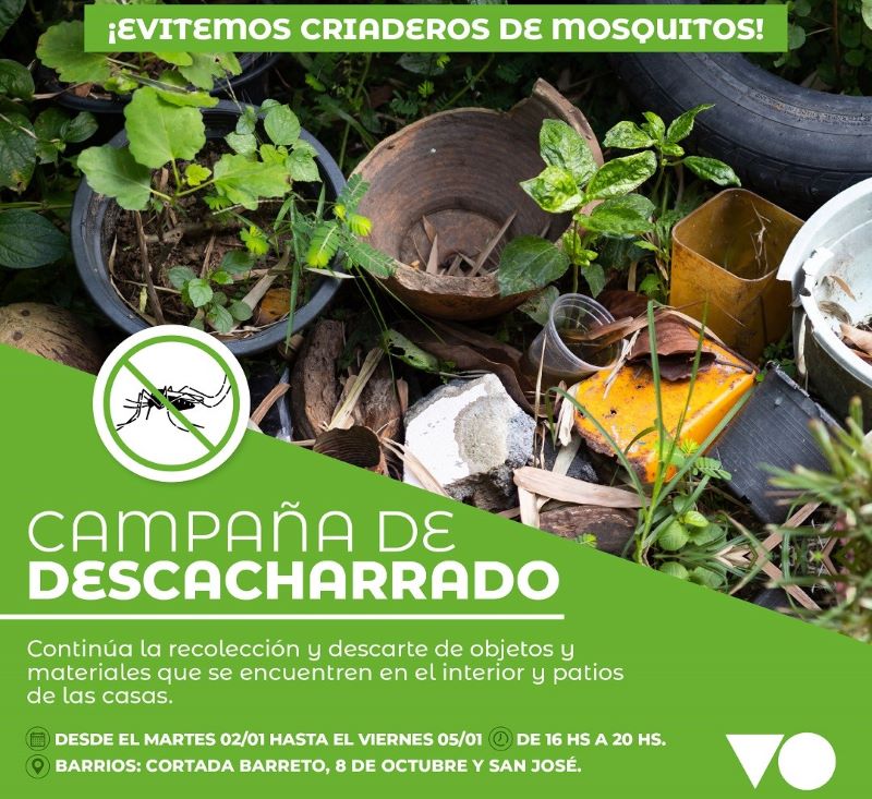 La Municipalidad de Villa Ocampo comunica que desde el martes 2 al viernes 5 de enero, se debe sacar a la vereda todos los OBJETOS Y MATERIALES que no sirvan (como metales, chatarra, cubiertas viejas y objetos grandes) que se encuentren en el interior y patios de nuestras casas para evitar criaderos de mosquitos.