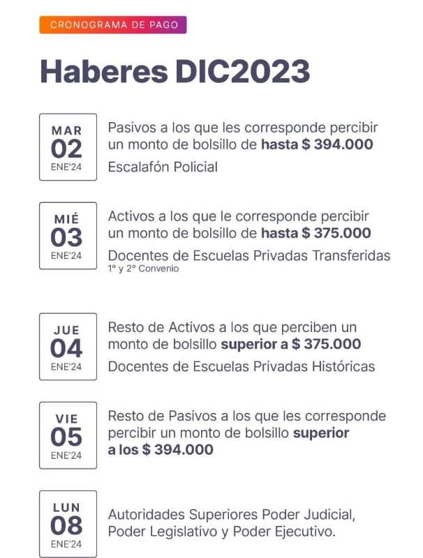Cronograma de pago de haberes del mes de diciembre de 2023