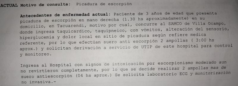 «Mi niño fue picado por una alacrán y fue atendido en el hospital de Villa Ocampo y luego trasladado al hospital de Reconquista, llevado a terapia intensiva a causa de la picadura del veneno del alacrán que tiene complicaciones muy severas, como ser taquicardia, vomito y problema respiratorios», explicó Marisol, la mamá del chico, mariisol.wirth