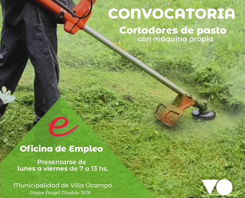 La Municipalidad de Villa Ocampo, a través de la Oficina de Empleo, convoca a cortadores de pasto que cuentan con máquina propia, a presentarse de lunes a viernes de 7 a 13 hs. en dicha oficina (Padre Ángel Tibaldo 1578).