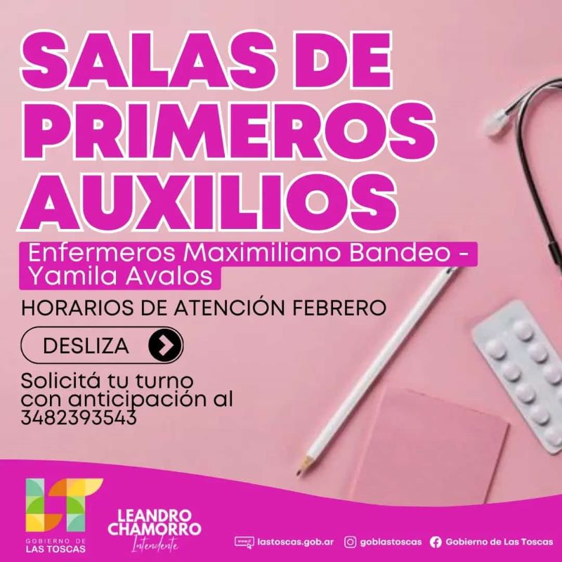 El gobierno de la ciudad de Las Toscas informa a la comunidad sobre los horarios y días de atención médica y de enfermería en las salas de primeros auxilios de los diferentes barrios de la ciudad.