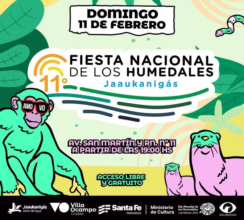 Programa completo de la 11ª Fiesta nacional de los Humedales «Jaaukanigás», para los días 10, 11 y 12 de febrero en la ciudad de Villa Ocampo.