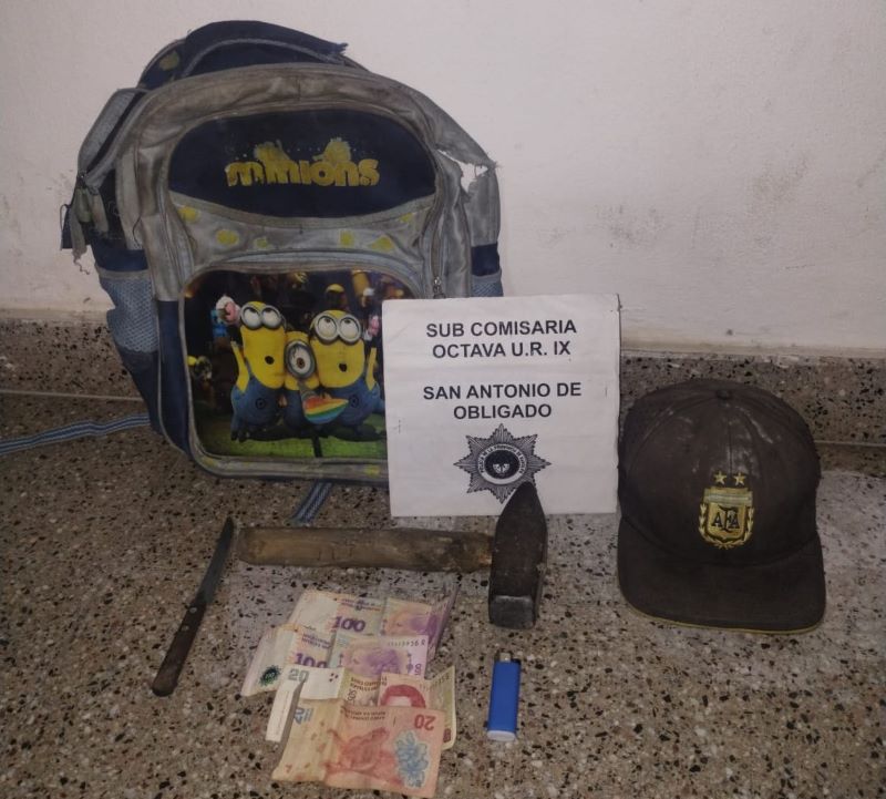 Seguidamente realizaron el secuestro preventivo de (01) una mochila tamaño mediana, con dibujos animados de MINIONS, la cual contenía en su interior (01) un martillo tipo maza, cabo de madera, (01) un cuchillo tipo serrucho, marca TRAMONTINA, una hoja metálica y cabo de madera, y dinero en efectivo, discriminado en billetes de distintas nominaciones (02) dos billetes de cien pesos, Dos billetes de veinte pesos y un encendedor color azul inscripción BX7. Se dio conocimiento a fiscal en turno Dr. NORBERTO RIOS y al Servicio Público Defensa Penal.