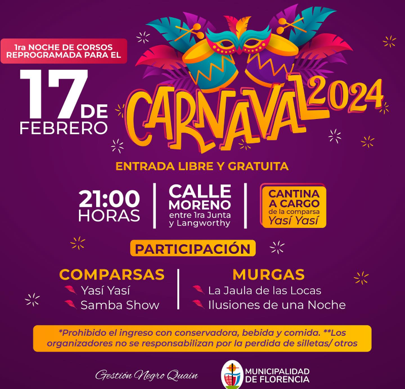 Este sábado se vivirá la primera noche de Carnavales en Florencia, con entrada libre y gratuita.