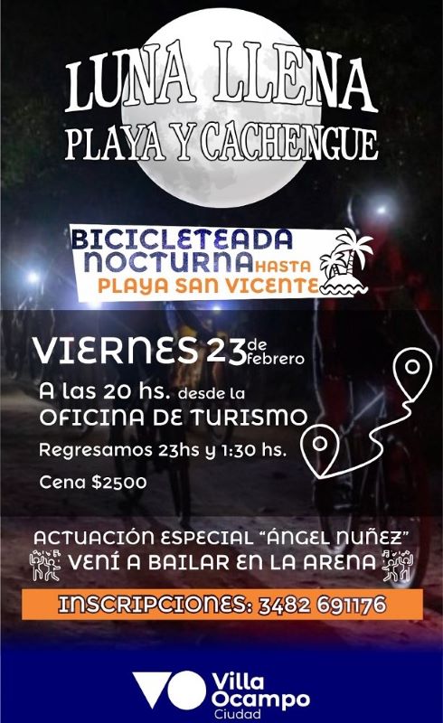 Las áreas de Turismo y Deportes de la Municipalidad de Villa Ocampo organizan la segunda bicicleteada nocturna a la Playa San Vicente con la actuación especial de Ángel Núñez.