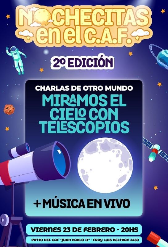 El Centro de Acción Familiar Juan Pablo II junto a la Secretaría de Cultura y Comunicación invitan a toda la ciudadanía a compartir otra noche en familia, en esta segunda edición de luna llena donde habrá música en vivo y observaciones al cielo con telescopios.