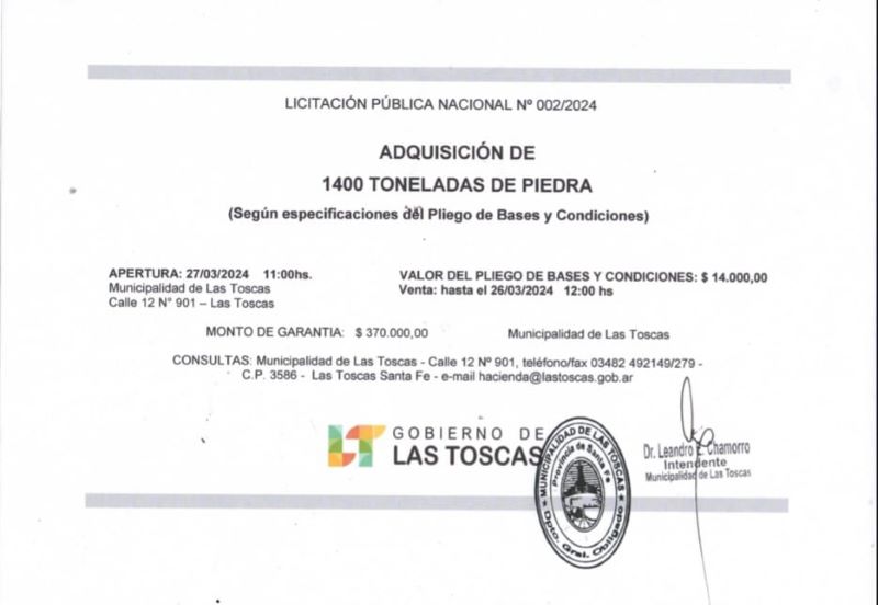 El gobierno de la ciudad de Las Toscas llama a licitación pública para la adquisición de piedras con el fin de concretar el estabilizado granular para las calles de la localidad.