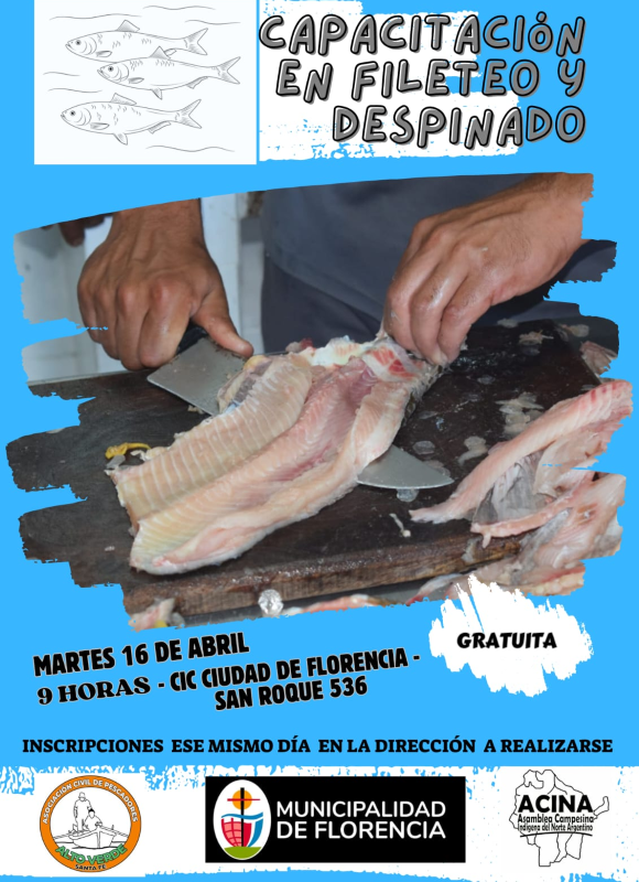 La municipalidad de Florencia informa que se llevvará a cabo una capacitación gratuita para fileteo y despinado de pescados, para este martes 16 de abril, a las 9 horas, en el Centro Integrador Comunitario.