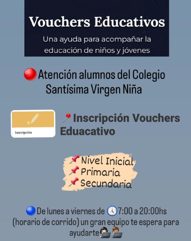 La inscripción se realiza para los alumnos de los tres niveles del Colegio Virgen Niña. Cabe aclarar que esta política de asistencia es implementada por el gobierno nacional y solo está destinado a los estudiantes de escuelas privadas o de gestión privada, cómo es el caso de la institución local.