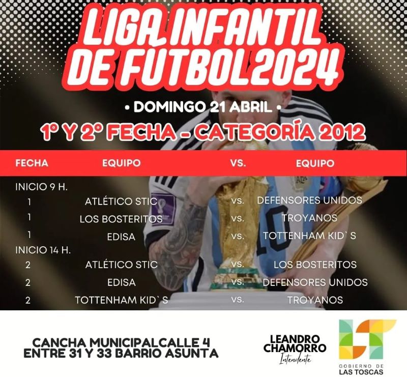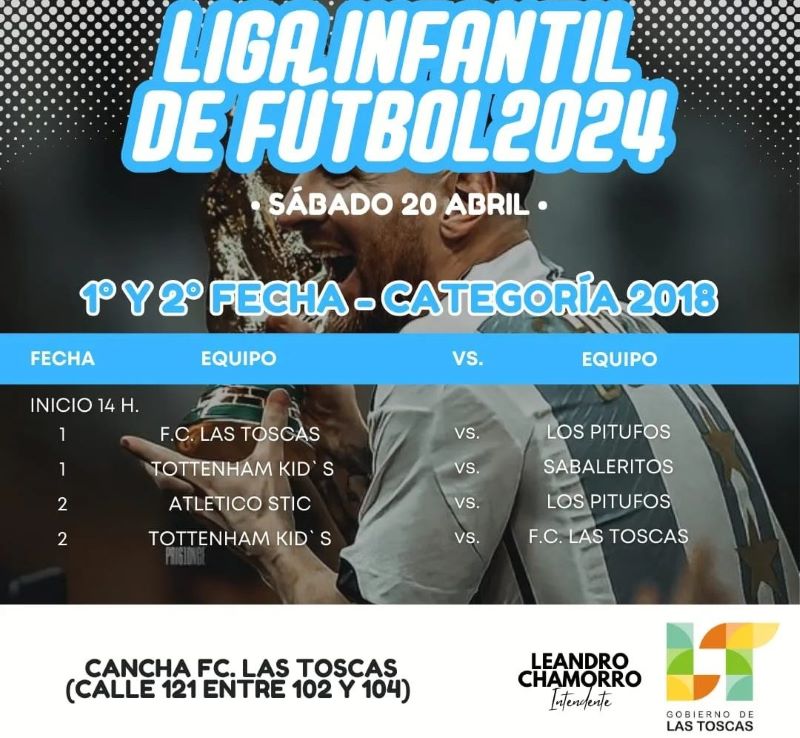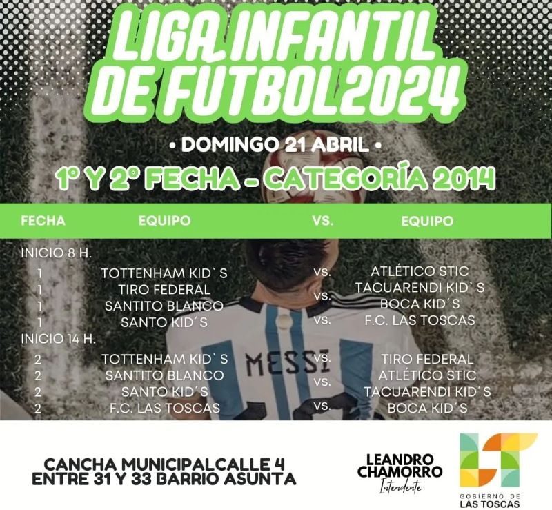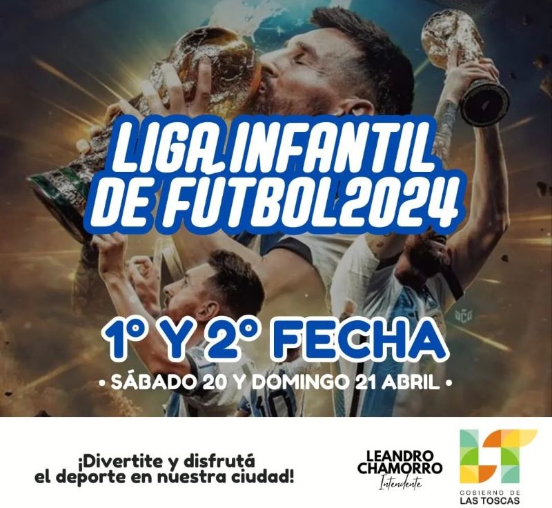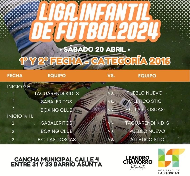 Este sábado 20 y domingo 21 de abril, a partir de las 9:00 horas, vení a acompañar a los más pequeños a disfrutar y compartir de dos jornadas a puro fútbol en la cancha municipal de calle 4 entre 31 y 33 en B° Asunta de la ciudad de Las Toscas.