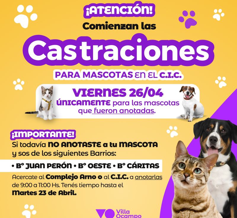 La Municipalidad de Villa Ocampo informa a la comunidad que el viernes 26 de abril se llevarán a cabo castraciones de mascotas en el Centro Integrador Comunitario (CIC) del Barrio Juan Perón.