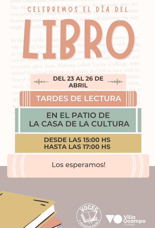 La Secretaría de Cultura y Comunicación de la Municipalidad de Villa Ocampo junto al grupo VOCES, invitan a la comunidad a participar de tardes de lectura en el patio de la Casa de la Cultura (Tibaldo 1240) en el marco del Día Internacional del Libro.