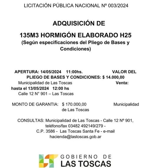 Destacadassociales Las Toscas: Licitación para compras de hormigón 26 abril, 2024 Compartir en Facebook Compartir en Twitter tweet El gobierno de la ciudad de Las Toscas llama a licitación para la adquisición 135 m3. de hormigón elaborado para la pavimentación de calle 37, cuya apertura se realizará el próximo 14/05/24, en el salón de conferencias, a las 11:00 horas.