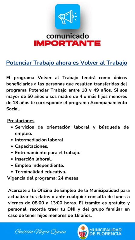 La Oficina de Empleo de la Municipalidad de Florencia, comunicó que aquellos vecinos que hayan sido beneficiados con el programa «Volver al Trabajo», que antes se denominaba «Potenciar Trabajo», deben actualizar sus datos en dicha dependencia.