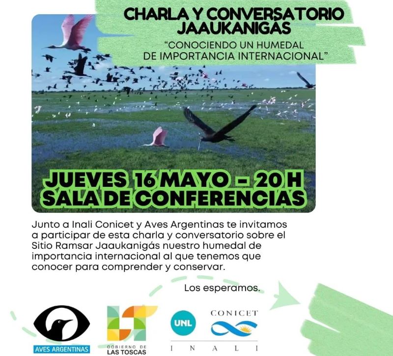 El gobierno de la ciudad de Las Toscas informa que el próximo jueves 16 de mayo, en la Sala de Conferencias a las 20 horas, Inali Conicet y Aves Argentinas brindarán una charla y conversatorio sobre el JAAUKANIGÁS.