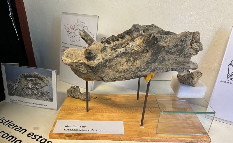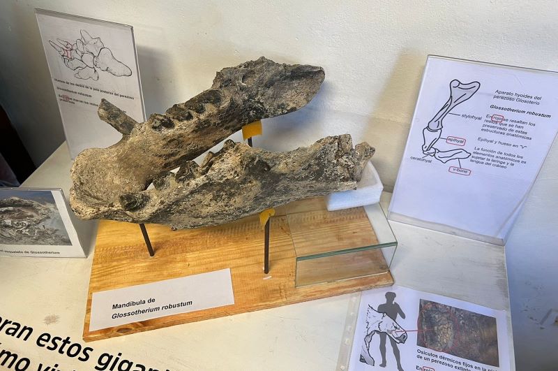 Y agregó al final: «Estamos hablando de un perezoso, que en una postura bípeda, es decir parado de sus extremidades posteriores, podría haber llegado a medir unos 3 metros de altura y algo también interesante es que estos animales están emparentados con las mulitas, con los armadillos, que a la vez en evidencia fósil son los clipTodonte y tienen esas corazas, esos caparazones de plaquitas dérmicas qué, en el caso de los perezosos también tenían esas estructuras, esas plaquitas pero eran completamente mucho más chiquitas que se llaman Oculos, que están en la piel y los van a poder ver en este caso porque algunos están pegados ya que quedaron en la mandíbula, por lo tanto van a poder identificar cómo eran esos huesecillos chiquititos», acotó.