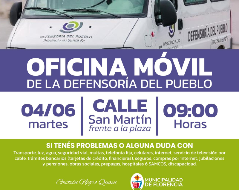 Ante los cuantiosos reclamos por la facturación de la EPE y otros servicios, la Oficina Móvil de la Defensoría del Pueblo atenderá en la ciudad, el próximo 4 de junio a las 9 horas, en plaza San Martín, frente a la plaza central.