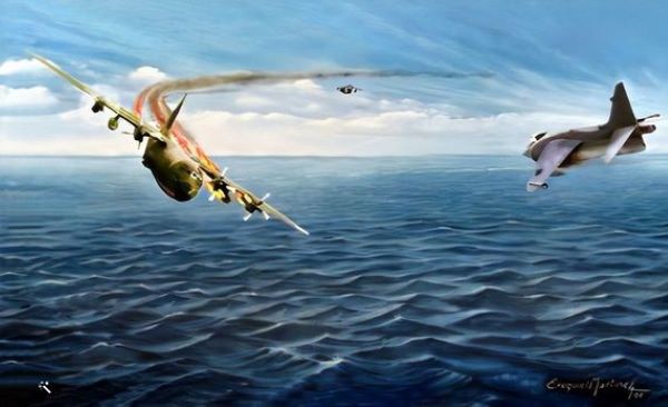 En uno de los ascensos, el Hércules fue detectado por la fragata HMS Minerva quien transmitió la información a una PAC de Sea Harrier’s que se encontraban en las proximidades.