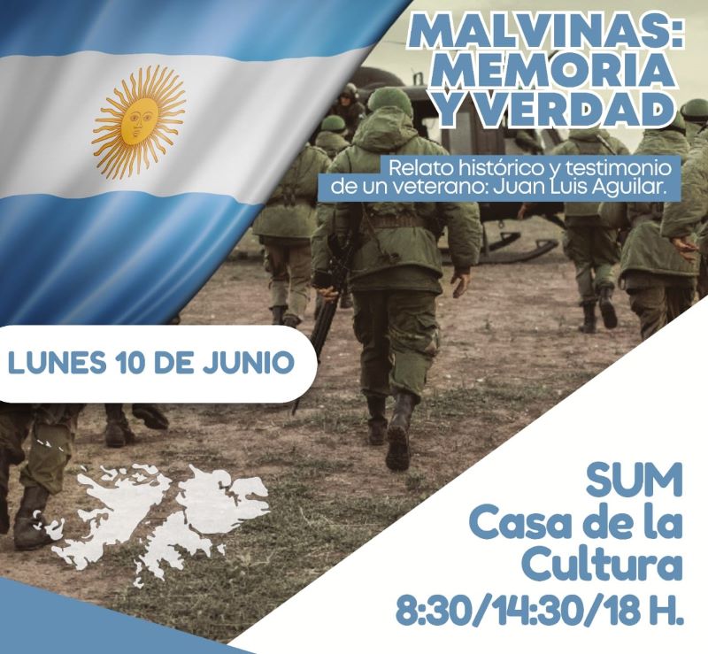 El gobierno de la ciudad de Las Toscas invita a toda la comunidad, especialmente a los estudiantes de nivel secundario y del Profesorado, a la charla «Malvinas: Memoria y Verdad», que se llevará a cabo el próximo lunes 10 de junio en el SUM de la Casa de la Cultura en tres horarios: por la mañana, a las 8:30 horas; por la siesta, a las 14:30 horas; y por la tarde, a las 18 horas.