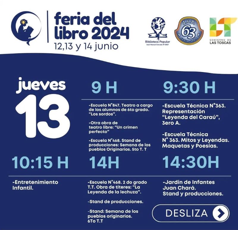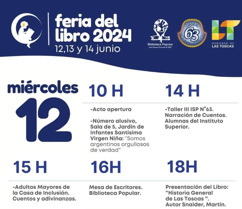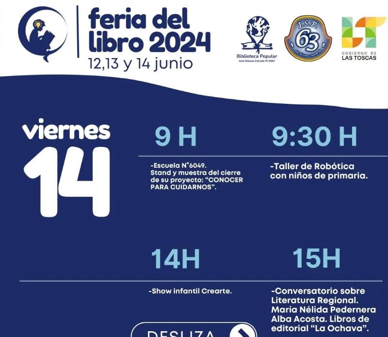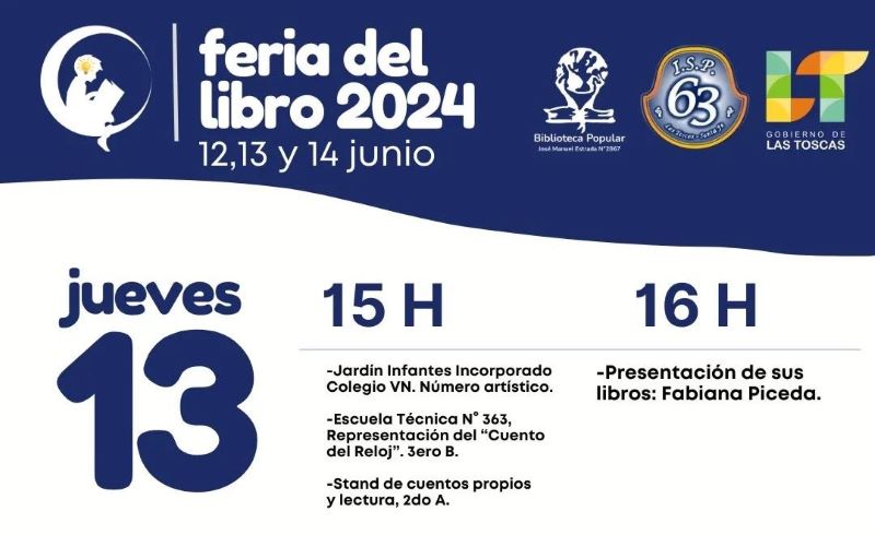 «Durante tres días, te invitamos a disfrutar de un mundo lleno de lectura, emocionantes presentaciones y muchas sorpresas. La Feria del Libro es una ocasión única para celebrar y compartir la magia de los libros con amigos, familiares y vecinos», comentaron desde la secretaria de Cultura de la municipalidad de Las Toscas.