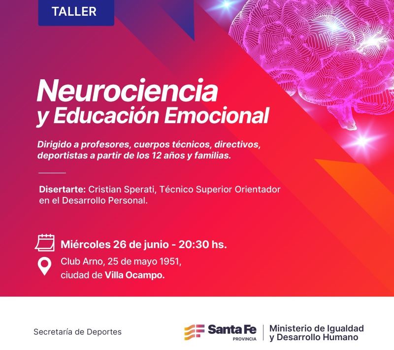 Desde las Secretarías de Desarrollo Humano de la Municipalidad de Villa Ocampo y Las Toscas, informan a la comunidad que desde la Secretaría de Deportes de la Provincia de Santa Fe, brindarán un taller de «Neurociencia y Educación Emocional».