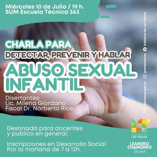 El gobierno de la ciudad de Las Toscas invita a la charla para detectar, prevenir y hablar sobre Abuso Sexual Infantil.