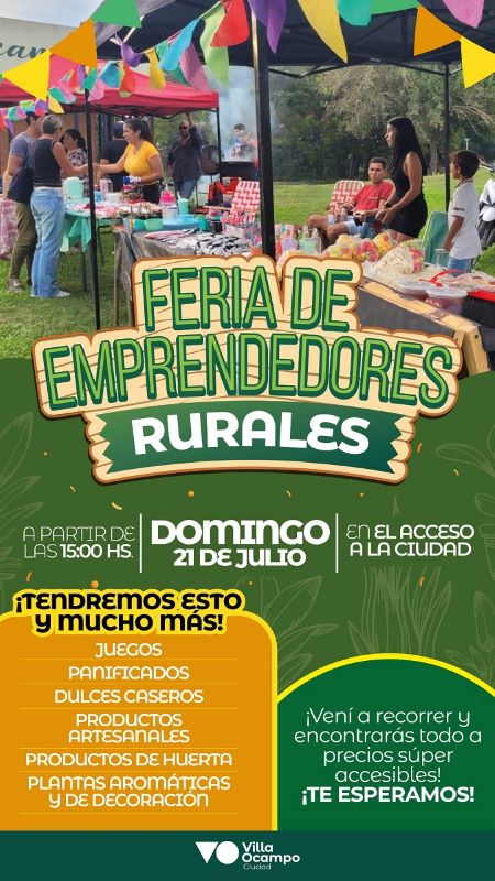 La Secretaría de Promoción Social de la Municipalidad de Villa Ocampo invita a una nueva edición de la Feria de Emprendedores Rurales, que se llevará a cabo este domingo 21 de mayo en el acceso principal a la ciudad (Av. San Martin y Ruta Nacional N°11), a partir de las 15 horas.