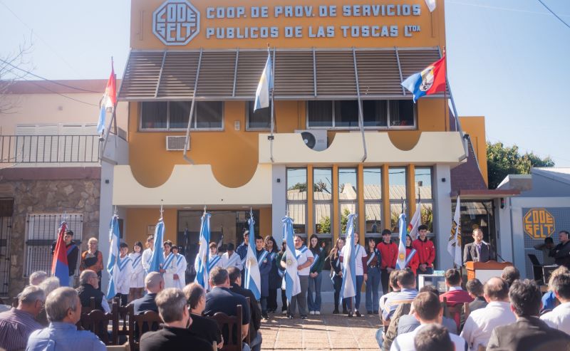 Frente a las oficinas centrales de CODESELT en Las Toscas, se llevó a cabo un emotivo acto para celebrar el 70° Aniversario de la Cooperativa de Servicios Públicos Las Toscas (CODESELT).