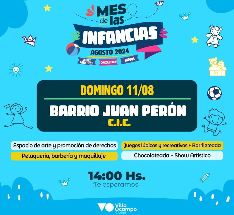 La Municipalidad de Villa Ocampo invita a la comunidad a sumarse al segundo festejo por el Mes de las Infancias, que se llevará a cabo este domingo 11 de agosto en el Centro de Integración Comunitaria (CIC) del Barrio Juan Perón.