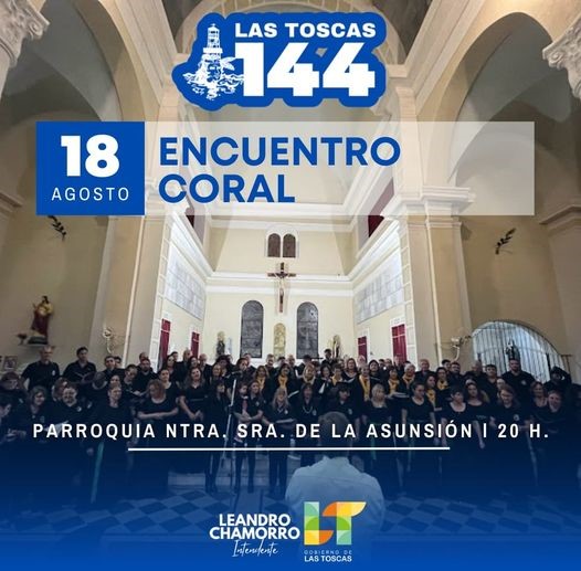 En el marco de las celebraciones por el aniversario de la ciudad de Las Toscas, invitan a una excepcional Muestra Coral que se llevará a cabo el domingo 18 de agosto en el templo parroquial.