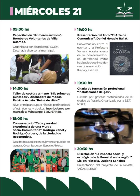 CulturaDestacadas 5ª Feria del Libro del Jaaukanigás: Actividades para este miércoles 21 de agosto 21 agosto, 2024 Compartir en Facebook Compartir en Twitter tweet Además, durante todo el día habrá un stand de la Dirección Provincial de Prevención y Promoción de la Salud, con material informativo sobre Dengue.