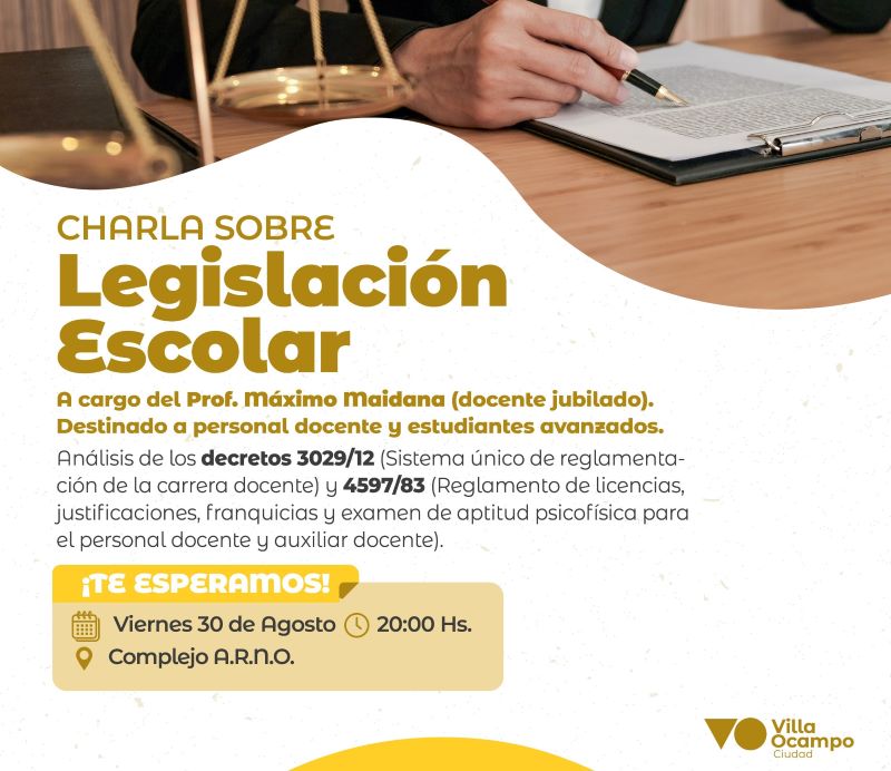 El área de Educación de la Municipalidad de Villa Ocampo invita a la comunidad a una charla sobre “Legislación Escolar” a cargo del Prof. Máximo Maidana (docente jubilado), destinado a personal docente y estudiantes avanzados.