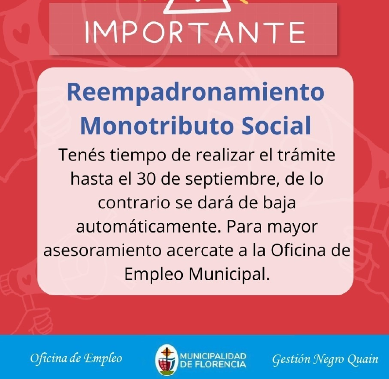 La Oficina de Empleo de la Municipalidad de Florencia, recuerda que solo hay tiempo hasta el 30 de noviembre para realizar el reempadronamiento de aquellos que son monotributistas sociales.