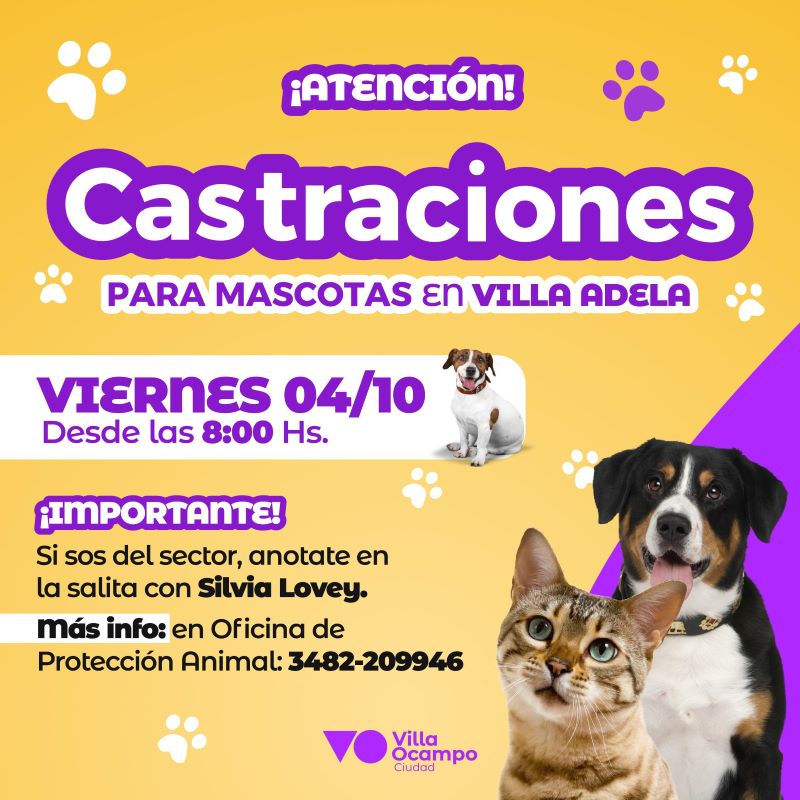 La Municipalidad de Villa Ocampo informa que el próximo viernes 4 de octubre, se llevará a cabo una nueva jornada de castraciones para mascotas en Villa Adela. Las intervenciones comenzarán a partir de las 8:00 horas y están destinadas a los vecinos del sector.