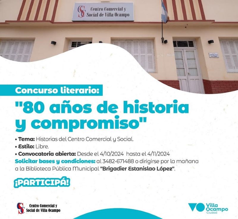 En conmemoración de su 80º aniversario, el Centro Comercial y Social de Villa Ocampo, junto a la Secretaría de Cultura y Comunicación de la Municipalidad de Villa Ocampo, lanza un concurso literario que invita a toda la comunidad a participar.