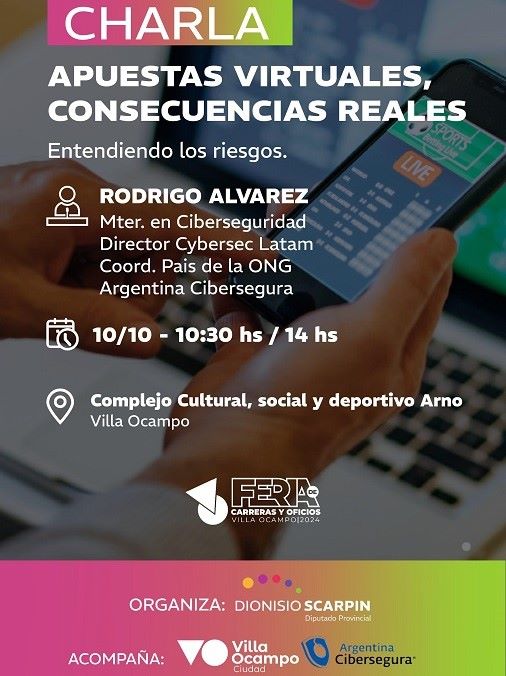 Además, a las 10:30 hs y a las 14 hs , se llevará a cabo la conferencia «Apuestas Virtuales, Consecuencias Reales: Entendiendo los Riesgos» , a cargo de Rodrigo Álvarez, Magíster en Ciberseguridad y Director de Cybersec Latam. Álvarez, quien también coordina en Argentina la ONG Cibersegura, abordará los riesgos asociados a las apuestas deportivas en línea y sus consecuencias, buscando crear conciencia sobre la importancia de la ciberseguridad en este ámbito. Esta actividad cuenta con el apoyo del diputado provincial Dionisio Scarpin.