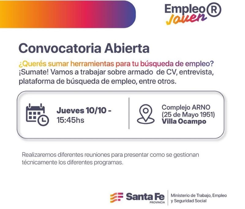 Una de las actividades destacadas es una convocatoria abierta del programa «Empleo Joven» (del Ministerio de Trabajo, Empleo y Seguridad Social de la provincia de Santa Fe), que invita a los participantes a sumar herramientas para mejorar su búsqueda de empleo. Se abordarán temas como el armado de CV, entrevistas laborales, y el uso de plataformas de búsqueda de empleo. Esta charla se realizará a las 15:45 hs.