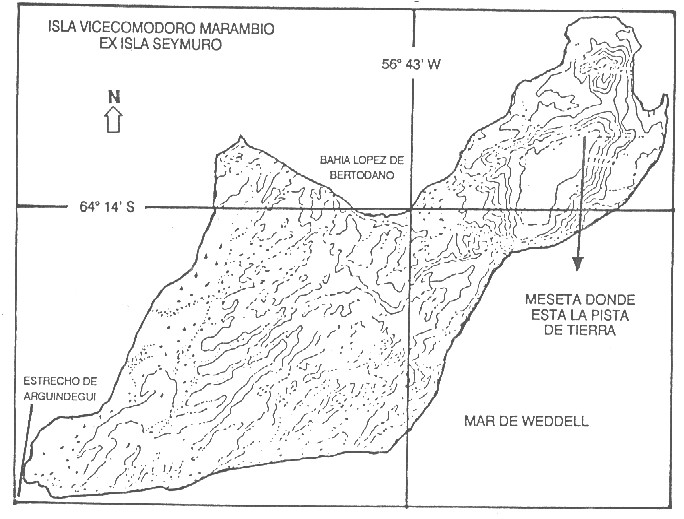 La isla Vicecomodoro Marambio (ExSeymour), emergió del mar en épocas muy remotas y su meseta que se elevó a 198 metros sobre el nivel del mar, tiene una superficie semiplana, con un suelo formado por barro de tierra arcillosa congelado (permafrost) aflorando piedras y rocas de distintos tamaños, diseminadas en toda su extensión.