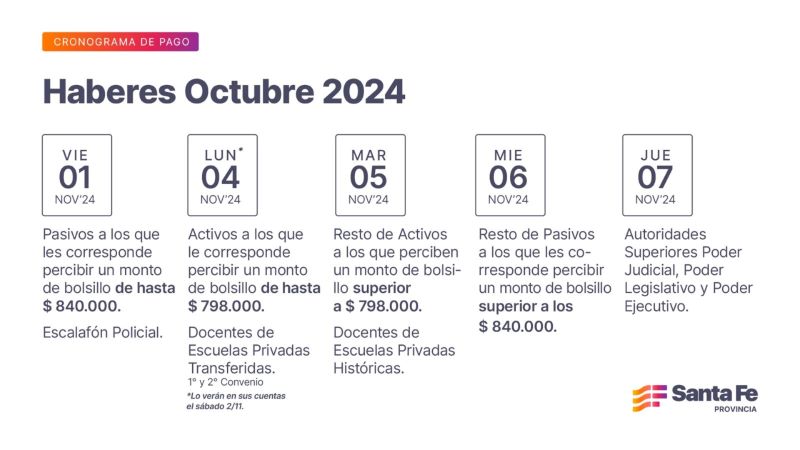 Cronograma de pago de haberes de octubre a trabajadores provinciales