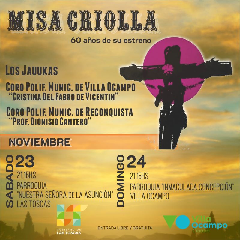 Este sábado 23 de noviembre, no te pierdas la oportunidad de presenciar la histórica Misa Criolla en el Templo Parroquial de Las Toscas a las 21:15 horas, con una segunda presentación el domingo 24 en el Templo Parroquial de Villa Ocampo en el mismo horario.