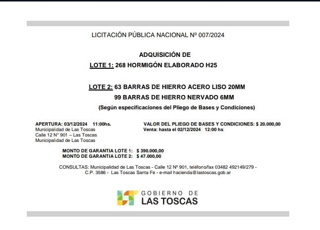 La municipalidad de Las Toscas llama a LICITACIÓN PÚBLICA NACIONAL N°007/2024, para la adquisición de dos lotes.