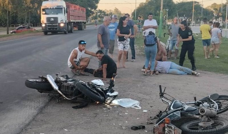El móvil, con tres efectivos uniformados llegan al lugar indicado y se encuentran con un accidente sucedido en la ruta nacional N° 11 e intersección del ingreso a calle 2; (Colectora), donde, por causas que se trata de establecer, entraron en colisión una motocicleta marca Motomel CG 150 CC, color negro, dominio 779-JLZ, conducida por Nahuel Pulzoni, de 32 años de edad, domiciliado en zona rural El Rabón, quien circulaba por ruta nacional N° 11 sentido norte-sur y llevaba como acompañante a su mamá, Esperanza Margarita Ledesma, de 58 años, domiciliada en zona rural El Rabón y la motocicleta marca Rouser, modelo NS, de 200 CC, color negra, dominio 249-LOQ, conducida por Vladimir Joaquín Lugo, de 39 años de edad, domiciliado en calle entre 8 entre calle uno y tres del barrio Itatí de Las Toscas, quien circulaba por ruta nacional N° 11 en sentido sur-norte.