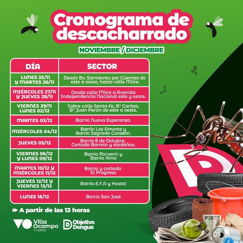 La Municipalidad de Villa Ocampo informa que, en el marco del programa “Objetivo Dengue”, se llevará a cabo un operativo de descacharrado en distintos sectores de la ciudad durante el mes de noviembre y diciembre.