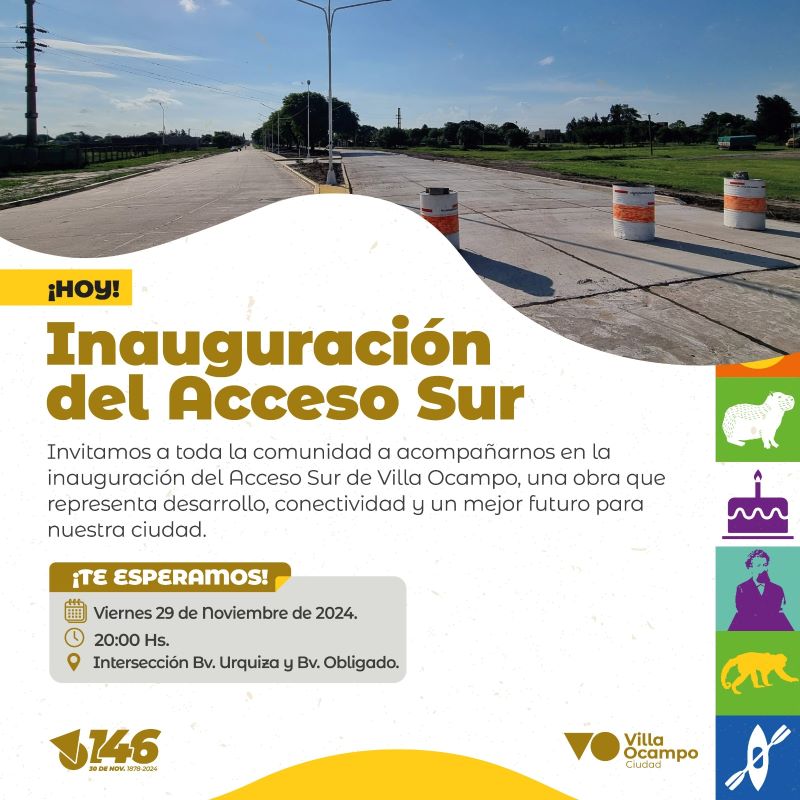 A las 20:00 horas , en la intersección de Bv. Urquiza y Bv. Obligado, se llevará a cabo el acto inaugural del Acceso Sur (prolongación del Bv. Urquiza hacia Ruta Nacional Nº 11), una obra que marca un antes y un después en la conectividad y modernización de la ciudad, además de mejorar la seguridad vial y el ordenamiento del tránsito pesado. La comunidad está invitada a formar parte de este importante acontecimiento en mejoras de infraestructura.