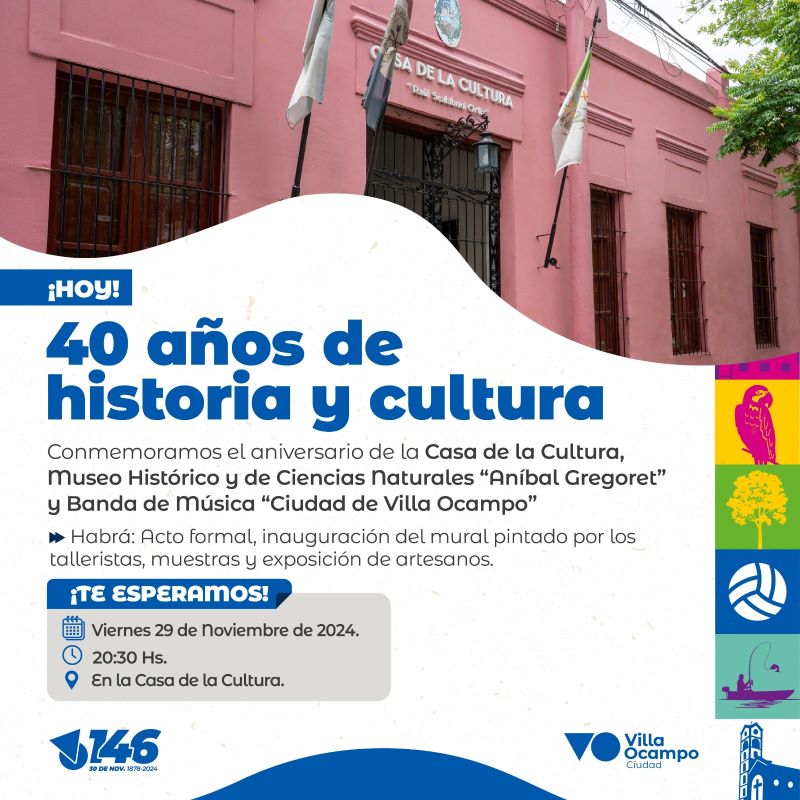A las 20:30 horas , en la Casa de la Cultura “Raúl Scalabrini Ortiz” (Tibaldo 1240) , se conmemorará el 40° aniversario de este emblemático espacio como también el Museo Histórico y de Ciencias Naturales «Aníbal Gregoret» y la Banda de Música «Ciudad de Villa Ocampo» . El evento incluirá un acto formal, la inauguración de un mural realizado por talentosos talleristas y una exposición de artesanos, en homenaje a cuatro décadas de trabajo dedicado al arte, la historia y la cultura.