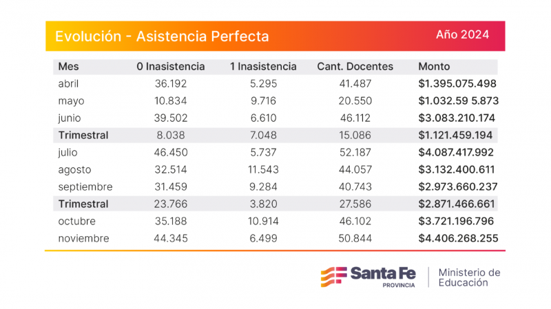 Cabe destacar que en noviembre, 44.345 docentes no registraron ninguna inasistencia y 6.499 sólo tuvieron una falta, y para ese mes el monto de inversión total del incentivo fue de $ 4.406.268.255.